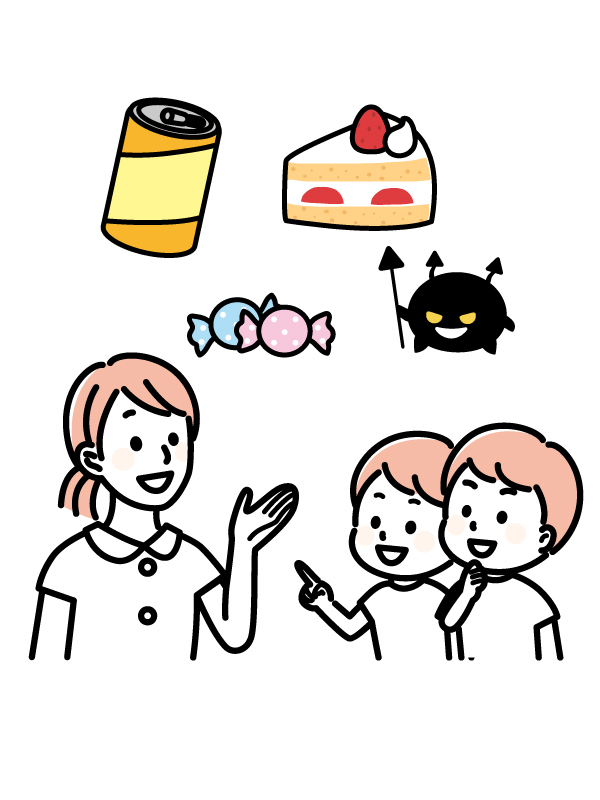 虫歯のリスクが高いと判断したお子様にはおやつ・ジュースなどの虫歯の原因になりやすい食べ物や飲み物について、どのようなペースで摂取しているかなど、保護者の方にご確認しながら、今後どのように与えていくべきか相談させていただきます。
